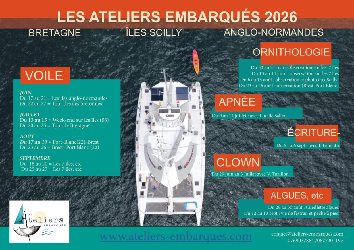 C’est l’histoire d’une rencontre impromptue au milieu du Pacifique. Moi qui touche la terre des Marquises après 28 jours de traversée du vaste océan á bord de Diatomée , eux ancrés avec Catafjord dans la baie de Taiohae. Une rencontre qui raisonne comme une évidence. Moi je plonge en apnée pour explorer le potentiel humain et pour témoigner de la magie de ce qu’il se passe sous la surface. Je filme, je photographie, j’écris, convaincu que l’expression artistique est un outil universel pour toucher le coeur et l’âme. Lucie et Jonathan en sont convaincus eux aussi. Ils ont transformé leur fier catamaran en une base de création et de partage au fil de l’eau, les Ateliers Embarqués. Mettre un pieds á bord, c’est la promesse d’une parenthèse enchantée sur les flots dans le monde des arts et de la création. Je suis fier et heureux d’être le deuxième parrain des Ateliers Embarqués.